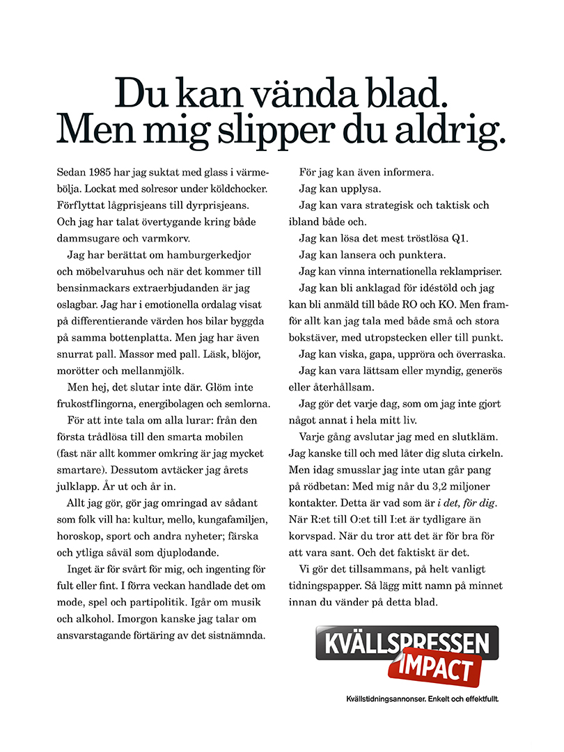 Since I graduated from Berghs School of Communication in 2004, I’ve created hard-hitting campaigns with measurable results for clients within: FMCG, Telecom, Travel, Fashion, Sports, Cars, Gaming, Beverages, Consumer Electronics, Bank and Media. Here are some copywriting examples.
